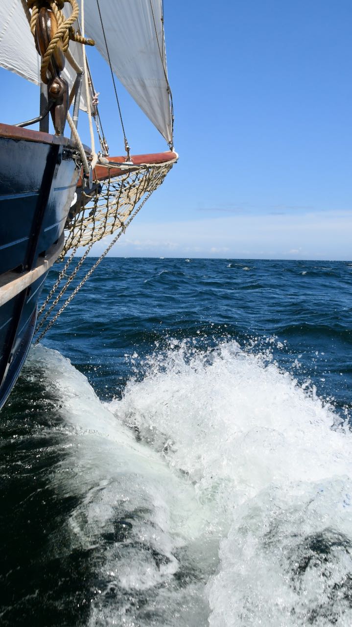 Eine klasse Crew, die da mit allen Kräften und viel Geduld mitgezogen hat! Schritt für Schritt zogen wir bei unserer Fahrt via Kopenhagen um die Südspitze von Schweden herum. Natürlich stellte uns das Wetter vor einige Herausforderungen: kräftiger Wind direkt beim Auslaufen in die Lübecker Bucht aus Nordost sowie zwei Tage später bei der Fahrt gen Norden aus Südwest verursachte solch kräftigen Seegang, dass wir ordentlich durchgeschüttelt wurden. Auch so findet alles seinen richtigen Platz… Und wir bekommen immer größere Ordnung auch bis in die letzten Ecken hinein und wachsen gut als Crew zusammen. Vor drei Tagen haben wir in Karlskrona die Wanten nochmals nachgespannt, so dass unsere schmucke Lady nun bestens getrimmt und damit wie ein großes Instrument richtig gestimmt ist. Und das Meer hat unsere Arbeit gleich im Anschluss kräftig getestet: bei der Ausfahrt legten uns Böen bis acht Windstärken kräftig auf die Seite und eine sehr aufgewühlte See schüttelte uns ordentlich durch. SAMYRAH ist nach ihrer Werftzeit nun noch deutlich kraftvoller geworden und die Liste der letzten kleinen Restarbeiten wird immer kürzer…